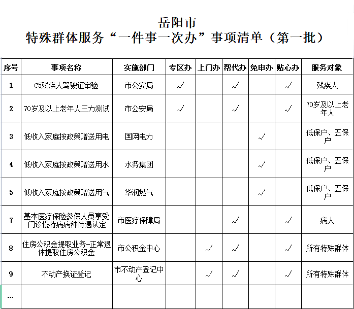 岳阳将特殊群体办证、补贴等高频服务事项汇总,建立特殊群体的政务服务事项库,深度优化服务流程,开通服务“绿色通道”,区分不同年龄阶段、不同生活习惯、不同情况的特殊群体,分类梳理出专区办、上门办、帮代办、免申办、贴心办等“五办”事项清单86项,采取有针对性、差异化的解决方案,为特殊群体提供个性服务。